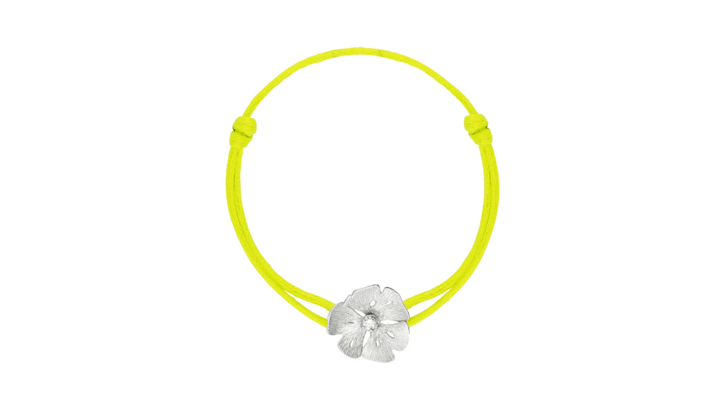 Trois feuilles de ginkgo aux reflets argentés se déploient pour donner vie à une fleur nouvelle, symbole d'espoir et de résilience. Ses pétales texturés à la main s'ouvrent sur un diamant lumineux. Noué d'un cordon décliné en 5 coloris, découvrez le Bracelet Blossom et rejoignez la communauté audacieuse et engagée des femmes Vever .