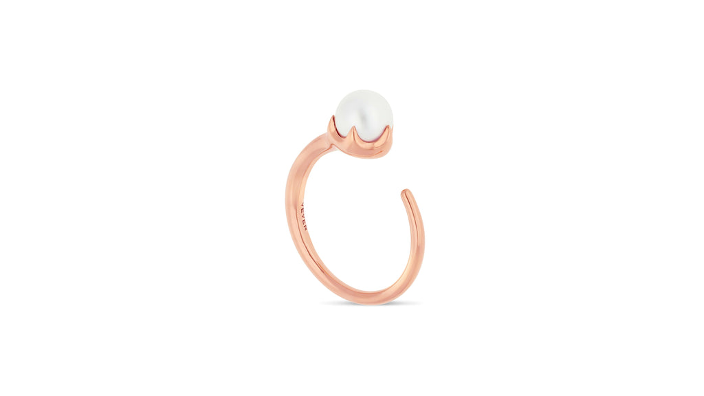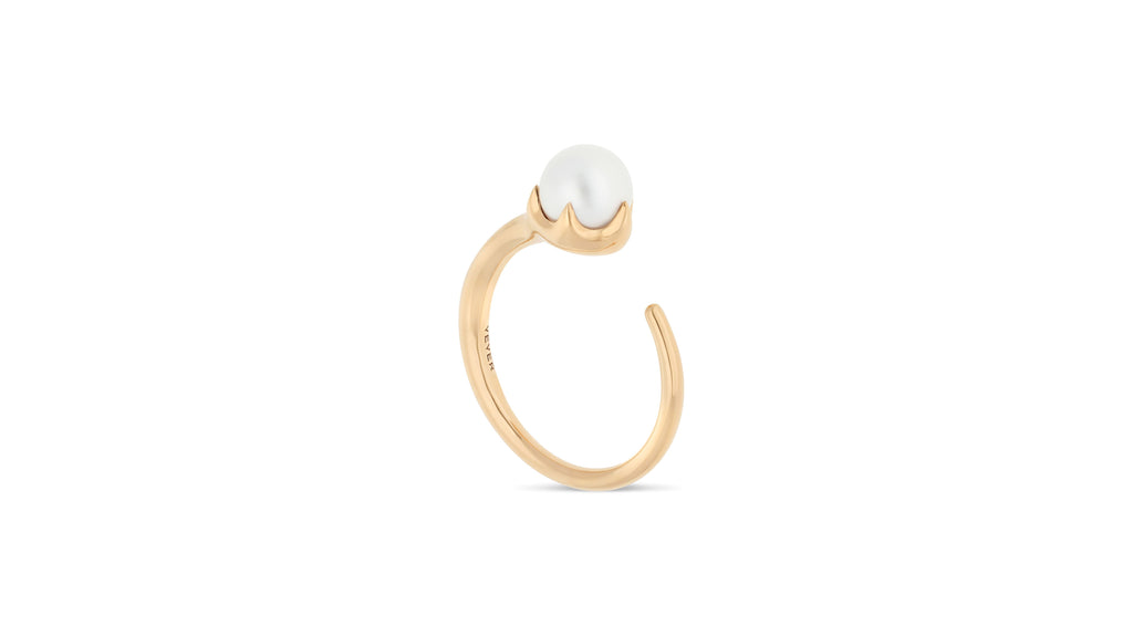 La bague Elixir s'enroule autour du doigt telle une liane, asymétrique et presque vivante. Elle est illuminée par l'éclat de la perle maintenue par un calice à 5 griffes, serti signature de Vever