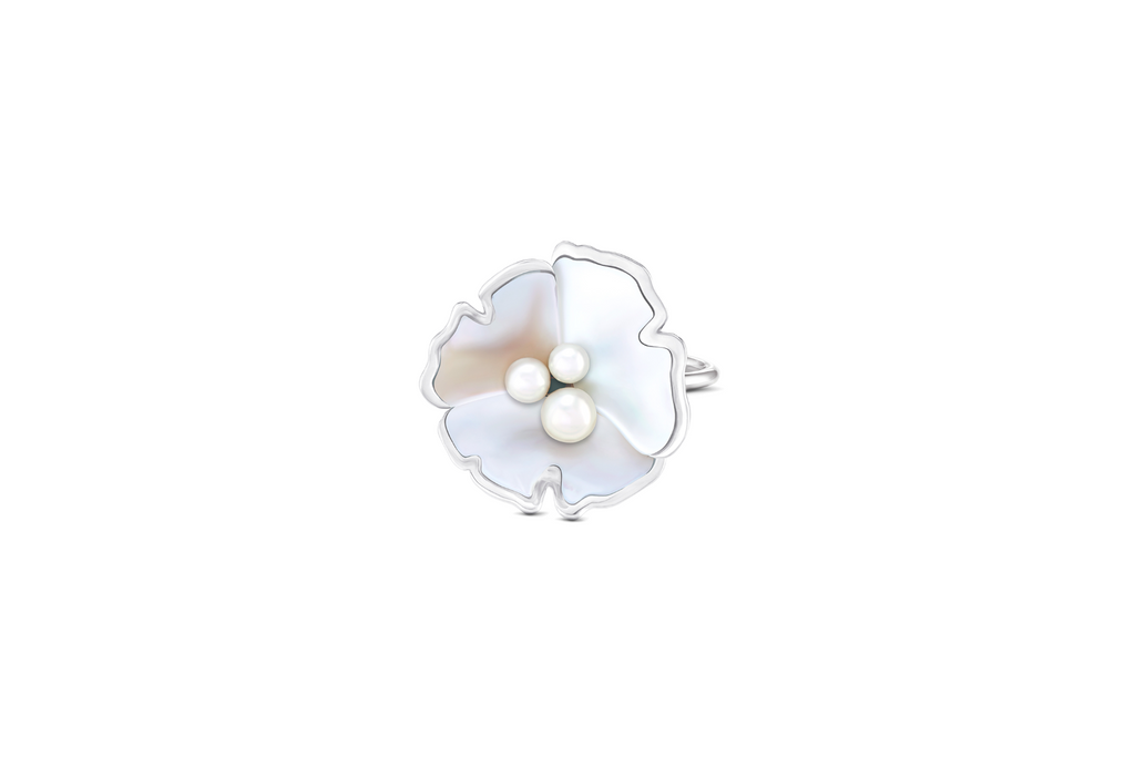 Trois feuilles de Ginkgo se déploient en corolle pour donner vie à une fleur nouvelle. Ses pétales de nacre au blanc lumineux révèlent des reflets irisés chatoyant doucement sur la main. En son cœur, 3 perles d'Akoya éclosent en un élégant bouquet.