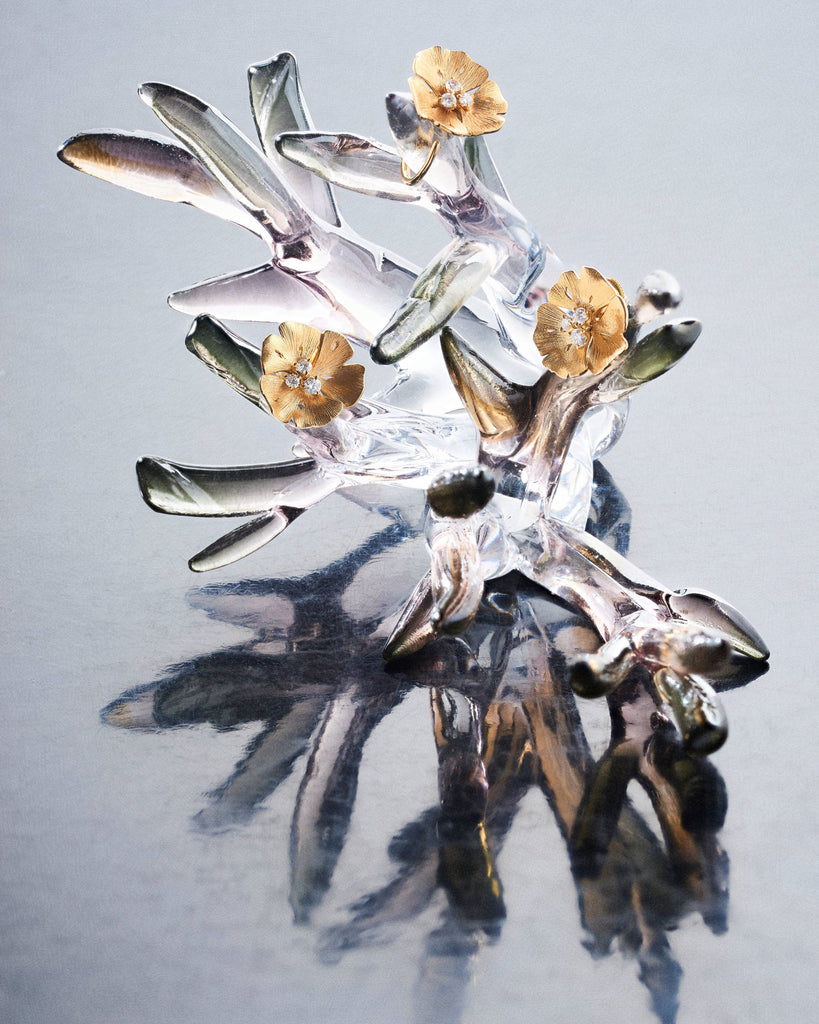 Trois feuilles de Ginkgo se déploient en corolle pour donner vie à une fleur nouvelle. Sa surface satinée joue avec les reflets de lumière.