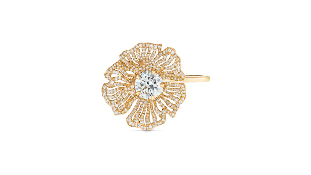Une fleur précieuse, fragile, délicate mais puissante en or travaillé en ajours, sertie d'un pavage étincelant.