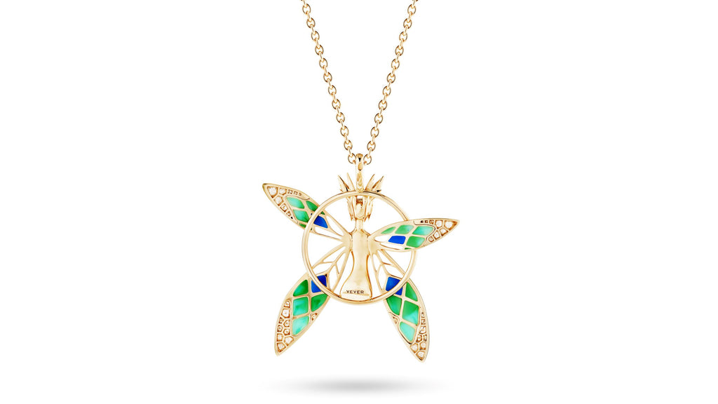 La Nymphe de Feu joue malicieusement avec la lumière, par la transparence de ses ailes en émail-à-jour et la brillance de son pavage. Ses ailes vibrent au timbre d’un précieux camaïeu mêlant le bleu et le vert.