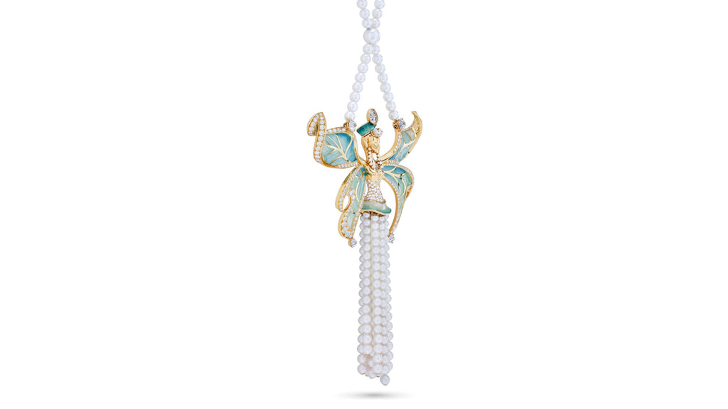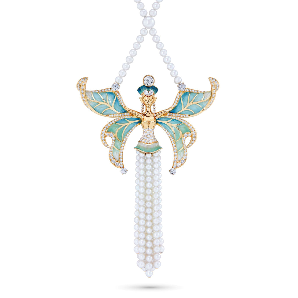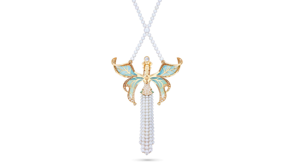 La transparence opalescente de l'émail-à-jour lui donne une couleur bleutée irréelle, sublimée par la douceur irisée des perles Akoya et la brillance des gemmes.