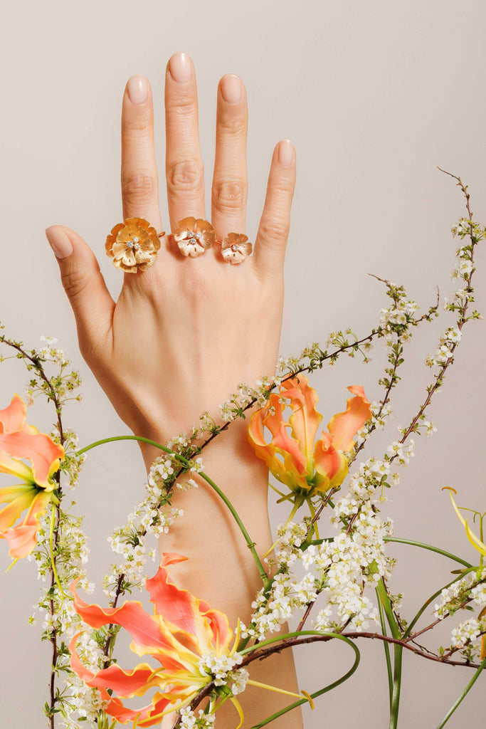 La version mini de notre bague signature Ginkgo, avec ses feuilles finement ciselées et un délicat pistil de diamant.
