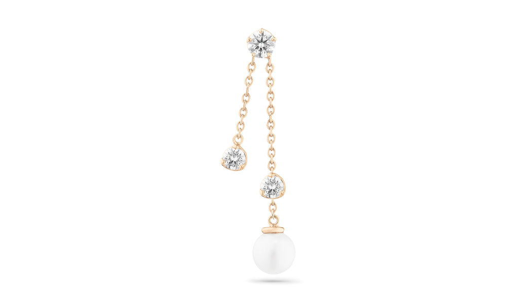 Une boucle d’oreille longue parée de trois diamants et ponctuée d'une perle lumineuse brille de tous ses feux et danse joyeusement le long du cou.