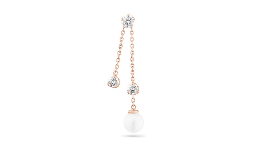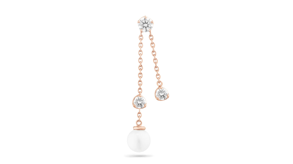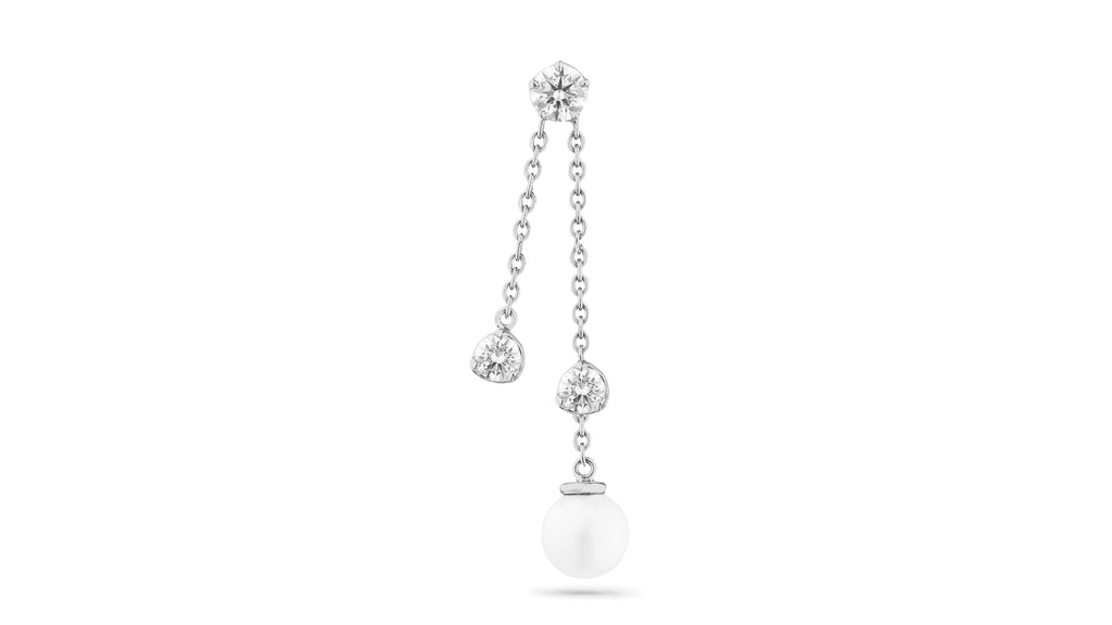 Une boucle d’oreille longue parée de trois diamants et ponctuée d'une perle lumineuse brille de tous ses feux et danse joyeusement le long du cou.