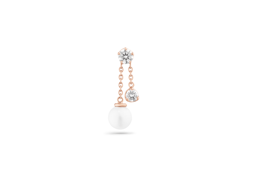 Une boucle d’oreille brille de tous ses feux avec ses deux diamants – l’un sur l’oreille, l’autre se balançant sur sa chaine - avec à ses côtés une perle unique évoluant sur sa tige dans une parfaite asymétrie.
