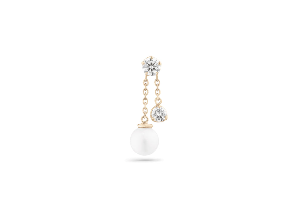 Une boucle d’oreille brille de tous ses feux avec ses deux diamants – l’un sur l’oreille, l’autre se balançant sur sa chaine - avec à ses côtés une perle unique évoluant sur sa tige dans une parfaite asymétrie.