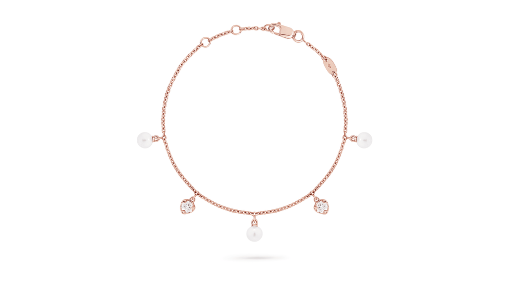 Comme les clochettes de muguet dansant joyeusement sur leur tige, les perles d'Akoya dansent avec les diamants nés de la rosée du matin et se posent délicatement sur le poignet.