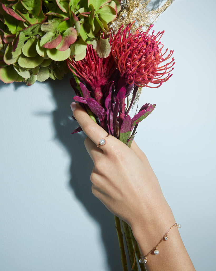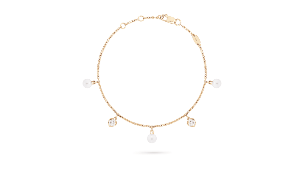 Comme les clochettes de muguet dansant joyeusement sur leur tige, les perles d'Akoya dansent avec les diamants nés de la rosée du matin et se posent délicatement sur le poignet.