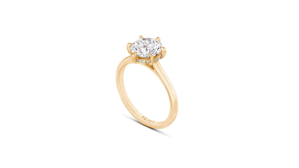 A solitaire inspired by nature. A ring with a pure, sensual line that wraps around the finger, sublimated by a magnificent round diamond embraced by 6 Vever claws and crowned with a belt of diamonds.